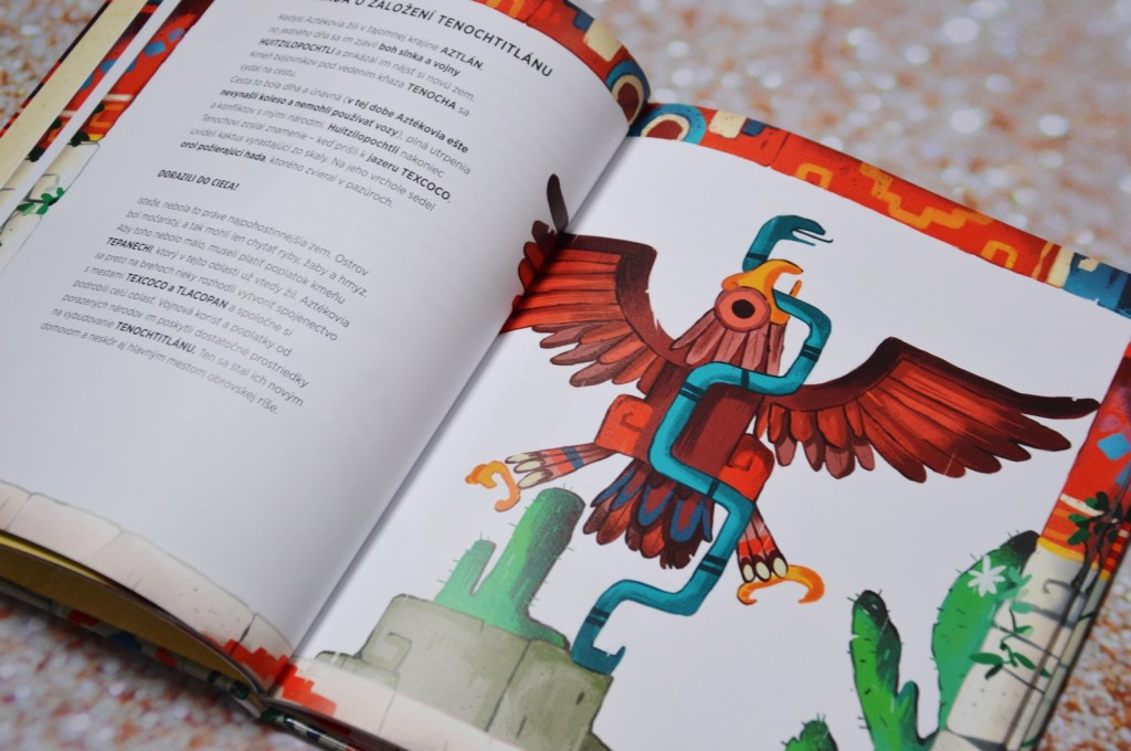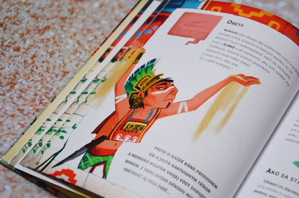 Spoznáme rôznych Bohov. Či už je to boh dažďa Tlaloc alebo Mixcoatl, ktorý je bohom lovu. V knihe ich je omnoho viac a ku každému si deti nájdu aj krátky popis a vysvetlenie. Musím však priznať, že ich mená sa len veľmi ťažko čítajú. V tejto knihe sa mi veľmi páčilo vysvetlenie hier. Napríklad loptová hra ollamalitzli alebo stolová hra patolli. Možno sa nimi budú deti inšpirovať. Ďalšou zaujímavosťou bolo použitie kalendára aj s obrázkami a rátaním. Okrem toho sa dozviete aj veľa iných zaujímavosti. Napríklad aj to, prečo sa Aztécke chrámy stavali stále vyššie a vyššie. A čo myslíte, podarí sa Avetlovi a Izel získať novú vázu skôr, ako stará mama zistí, že jej jednu rozbili?