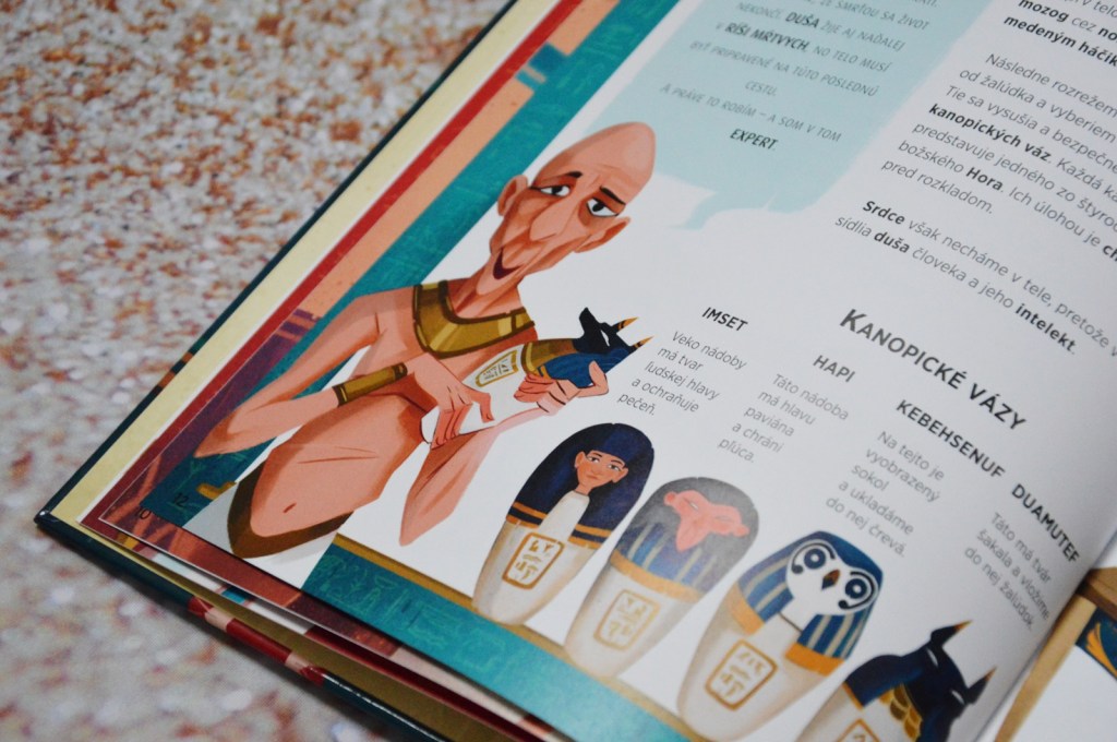 Kniha však obsahuje veľa iných faktov a zaujímavosti. Napríklad aj to, ako sa stavali pyramídy a prečo sú v nich tajné chodby. Ako to bolo v starovekom Egypte so vzdelaním a ako sú rozdelené sociálne vrstvy. Ani v tejto knihe nechýbajú rôzne božstvá. Deti sa dozvedia zaujímavý príbeh o Usire a Eset a ďalších členoch rodiny.