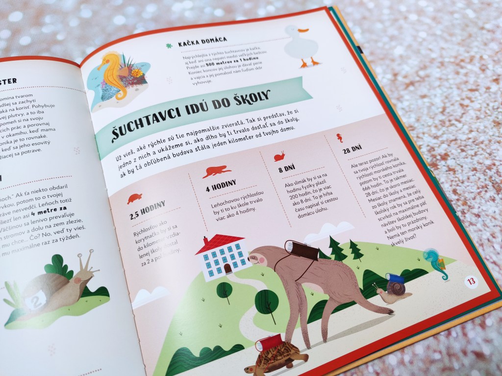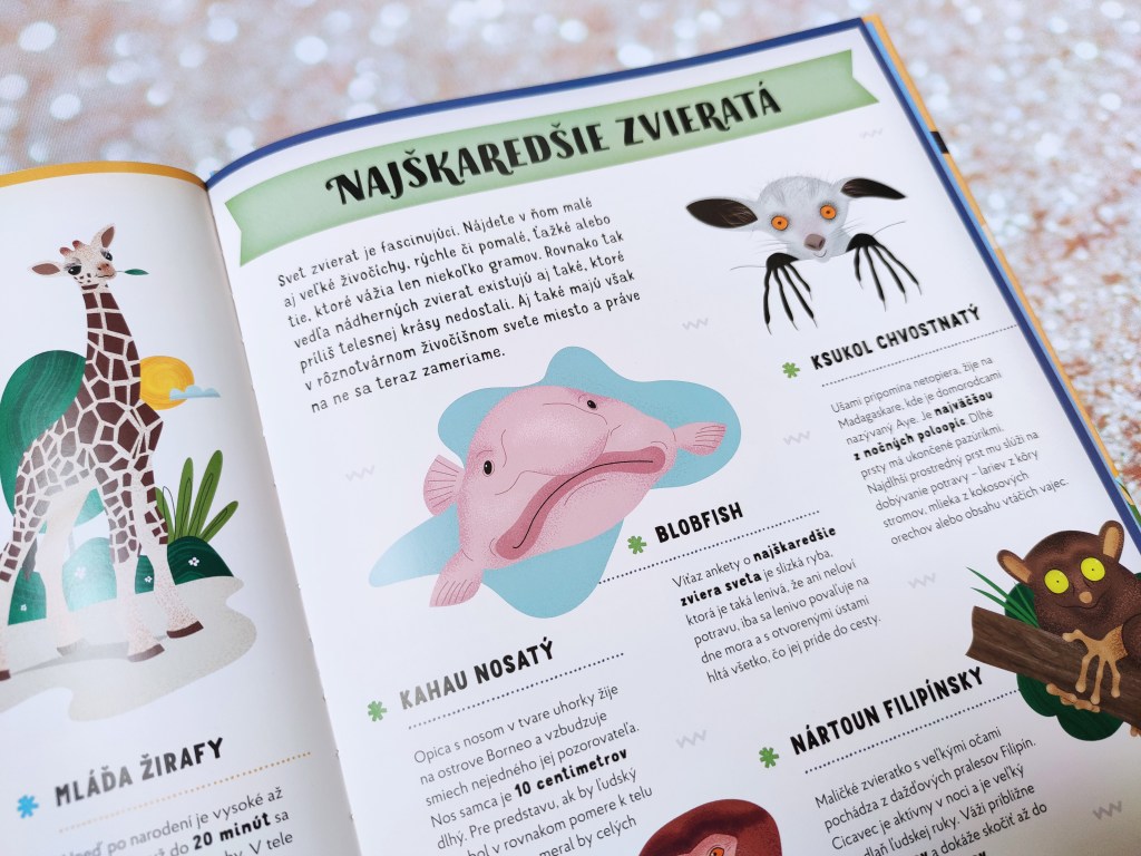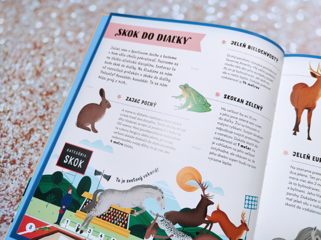 Kniha Rekordy zo sveta zvierat by nemala chýbať v knižnici žiadneho detského milovníka zvierat. Okrem toho, že sa deti naučia množstvo zaujímavých informácií, určite sa zabavia. Kniha je totiž zostavená hravou formou – ako preteky. Máte pocit, že ste na zvieracej olympiáde. Vekovo je určená pre deti od 6 rokov. Tým sa kniha bude páčiť určite najviac. Ja som si ju čítala s Matejkom, ktorý má tri a pol a taktiež ho zaujala. Pýtal sa na zvieratka. Keďže text pri každom je krátky, dokázal udržať pozornosť. Nehovoriac o tom, že ho zaujali roztomilé obrázky.