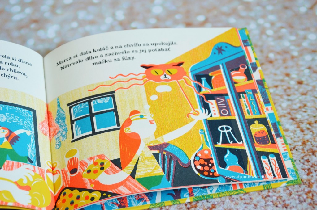 Táto kniha vás v kníhkupectvách určite okamžite upúta. Výrazné farby sú jednoducho neprehliadnuteľné. Vďaka tomu je iná ako ostatné detské knihy a ja sa z toho nesmierne teším. Ku knihe sa tieto abstraktnejšie obrázky hodia a myslím, že aj deti ocenia ich výnimočnosť. Netreba sa báť, že deti obrázky nepochopia. Je v nich zachytené všetko podstatné. Iba farebnosť je iná, ako sme zvyknutí.