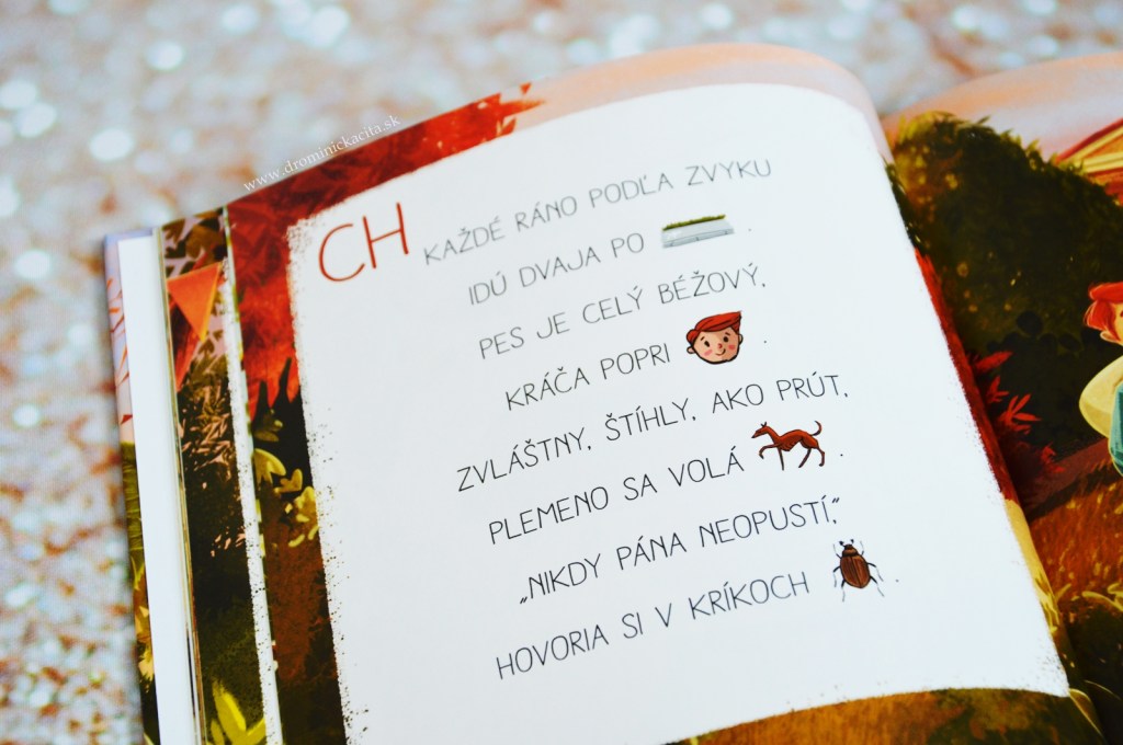 Kniha je veršovaná a veľmi interaktívna. Každé písmenko má svoju básničku. Tie sú zábavné v tom, že na konci verša je obrázok, podľa ktorého môže malý čitateľ verš sám doplniť. Každý verš sa pritom končí slovom začínajúcim na také písmeno, o ktorom je celá stránka. Môj syn sa na túto aktivitu hneď chytil a bavila ho. Občas sa stalo, že niektorý obrázok nevedel pomenovať. Vtedy som mu pomohla. Ak by ste mali pocit, že ani vy neviete nájsť správne slovo, nezúfajte. Na konci knihy nájdete zoradené pekne podľa písmen a pomenované všetky obrázky.