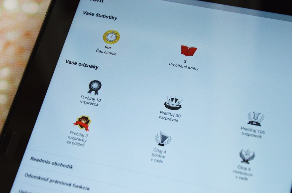 Pri používaní aplikácie môžete zbierať odznaky – odmeny za dosiahnuté čitateľské ciele, ale aj sledovať štatistiky používania. Zistíte tak, ako dlho ste čítali a koľko príbehov ste prečítali.