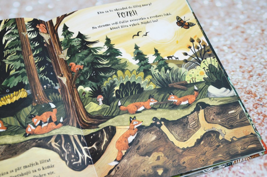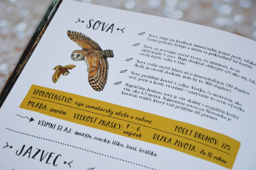Ďalším skvelým bonusom sú základné informácie o zvieratkách, ktoré sa v knihe objavia. Deťom tak môžete prečítať o kopytníkoch, líškach, medveďoch, ale aj včielkach či králikoch. Pri každom je okrem základných informácií – dĺžke života, spoločenstve a obydlí aj niekoľko zaujímavostí. Tak napríklad, vlk ma 100x citlivejší sluch ako človek. Fúziky králika majú zhruba šírku ich tela a vďaka tomu vedia, či sa vojdú do nory bez zaseknutia. Zaujímavým faktom pre nás bolo aj, že sova má mimoriadne jemné perie, vďaka ktorému lieta veľmi potichu a môže sa nečujne prikradnúť ku koristi.