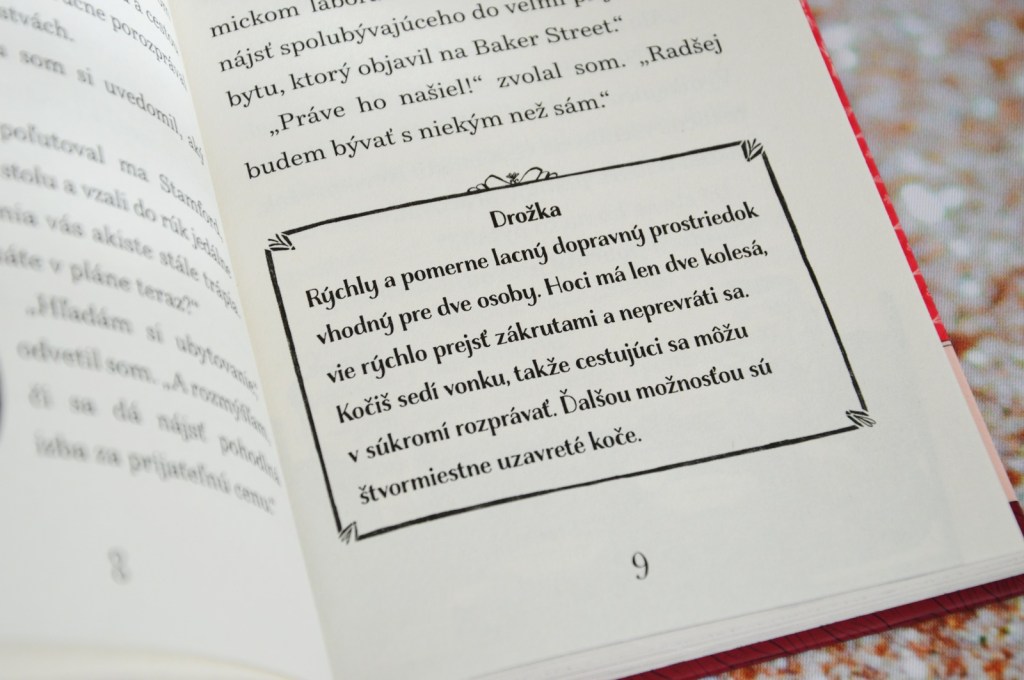 Príbeh z pera Sira Arthura Conana Doyla pre detského čitateľa upravila Stephanie Baudet. Rozhodne sa jej to podarilo. Graficky je kniha veľmi dobre spracovaná. Veľké písmená deťom uľahčia čítanie. Jazyk je prispôsobený pre mladého čitateľa. Najviac oceňujem vysvetlenie pojmov, ktoré by deti v tomto veku nemuseli poznať. Napríklad drožka, či telegraf. Deti isto zabavia aj drobné odkazy popri hlavnom texte.