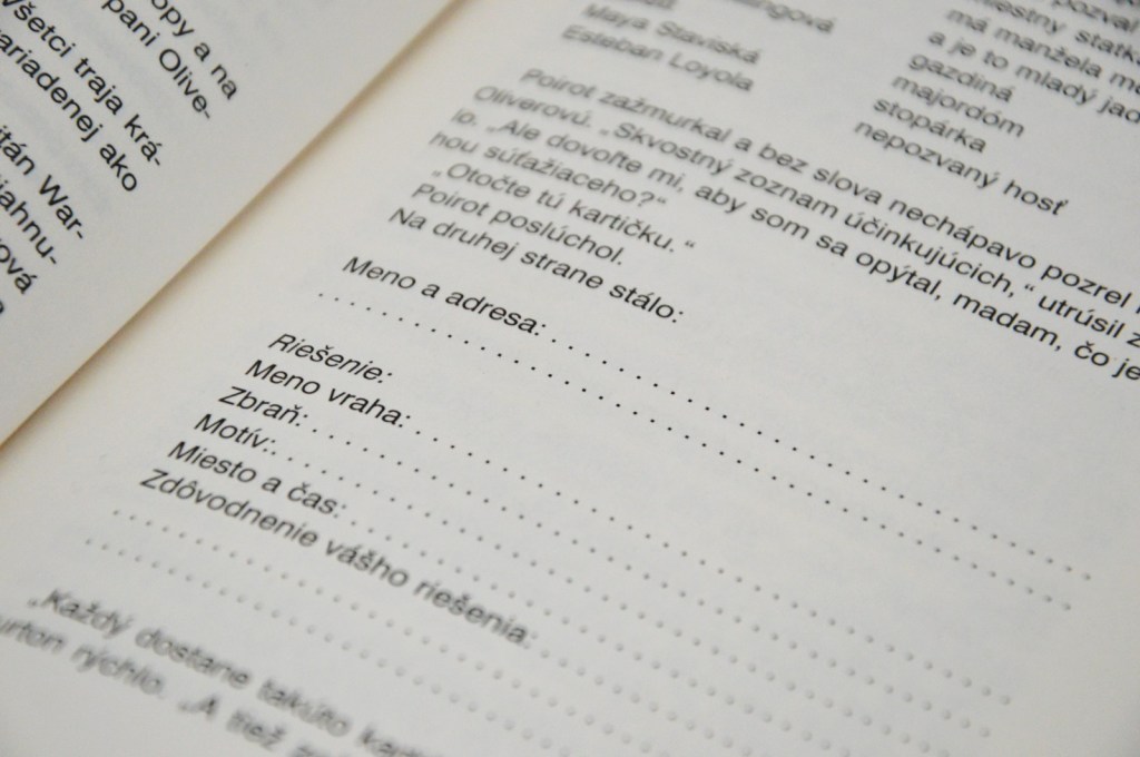 Mne sa veľmi páčila aj zápletka. Hra na vraždu, kde súťažiaci zbierajú indície. Hoci už z anotácie som vedela, že príde aj ku skutočnej vražde, tak ma to zamrzelo. Bola som nesmierne zvedavá, prečo prišlo mladé dievča o život. Indície skutočného vyšetrovania ukazovali rôznymi smermi. Páčili sa mi aj myšlienkové pochody Poirota. Zbožňujem, ako sa tieto vraždy vyriešia vďaka nepatrnému detailu.