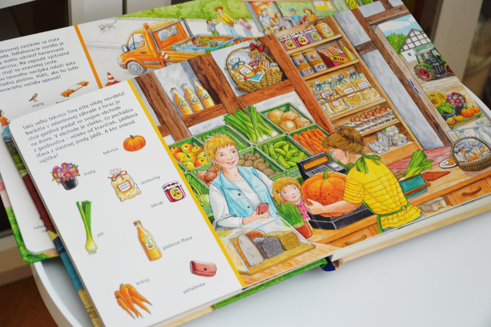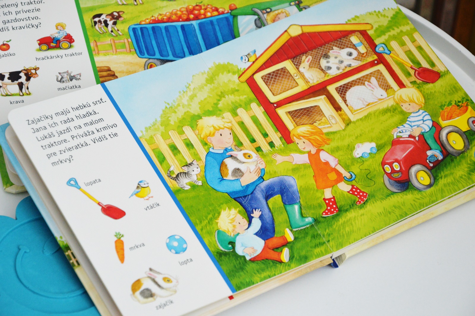 Začala by som knihami pre menšie deti – od jedného roka. Tieto nesú názov Moja prvá knižka Nájdi a ukáž. V ponuke ich nájdete s podtitulom Vozidlá a Gazdovstvo. Je už len na vás, ktorú pre svoje dieťa vyberiete. Obe sú vhodné tak pre chlapcov, ako aj pre dievčatká. Na siedmich dvojstranách nájdu deti veľa krásnych obrázkov, ale aj úloh. Vľavo je kúsok textu, ktorý je prispôsobený detským uškám. Obsahuje citoslovcia, ktoré môžu deti opakovať spolu s vami. Navyše sú použité aj zdrobneniny, čo je malým deťom milšie.