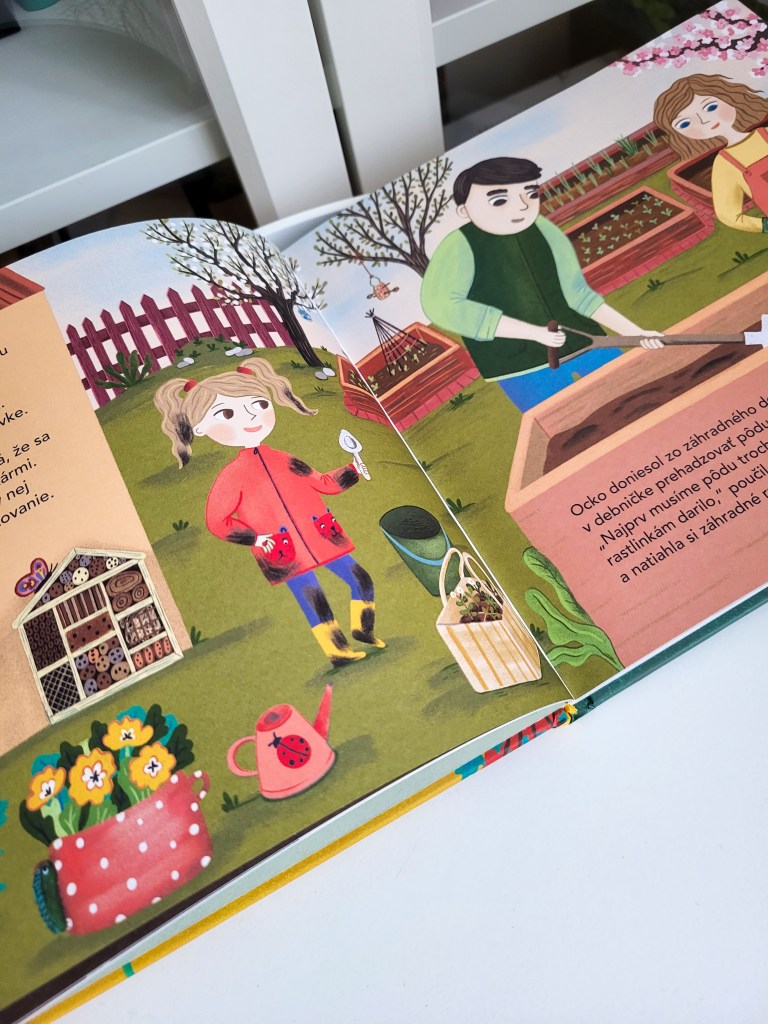 Hneď v prvom príbehu sa ocitáme v komunitnej záhrade, kde je Glória zašpinená od hlavy po uši. Spolu s rodičmi sa pustia do sadenia. Jednoduché inštrukcie ako sa pripravuje pôda a ako sa sadí. Prečo nemôžeme sadiť všetky semienka na jedno miesto? Aj to sa Glória naučí a deti spolu s ňou. Zistíme aj to, čo sa môže stať, ak si dievčatká zabudnú dať dole svoje obľúbené prstienky. Príbeh deťom veľmi pekne ukazuje, koľko radosti im vie dať práca v záhradke. Ako sa môžu tešiť z postupného rastu zeleniny a ovocia. Aj u nás doma sa venujeme záhradke spolu s deťmi.