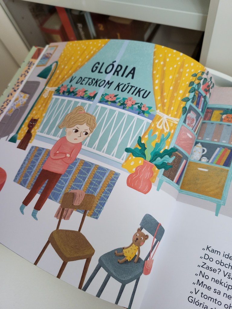 Ďalší príbeh nás zavedie do detského kútika. Miesto, ktoré pomôže pri veľkých nákupoch aj nám, aj deťom. Aby sa nestihli nudiť. Glória sa do detského kútika teší. Malým čitateľom autorka vysvetľuje, ako to v takom kútiku chodí. Dajú si menovku, uložia veci do skrinky a môžu sa hrať. Glória sa tentokrát skamaráti s ďalšími deťmi. Veľká zábava v kútiku sa však zmení na plač. Ako zareagovať, keď sa niekto zraní? A ako sa toho vyvarovať? Keď som tento príbeh čítala so synom, hneď mi povedal, čo robili deti zle a prečo sa niekto zranil.
