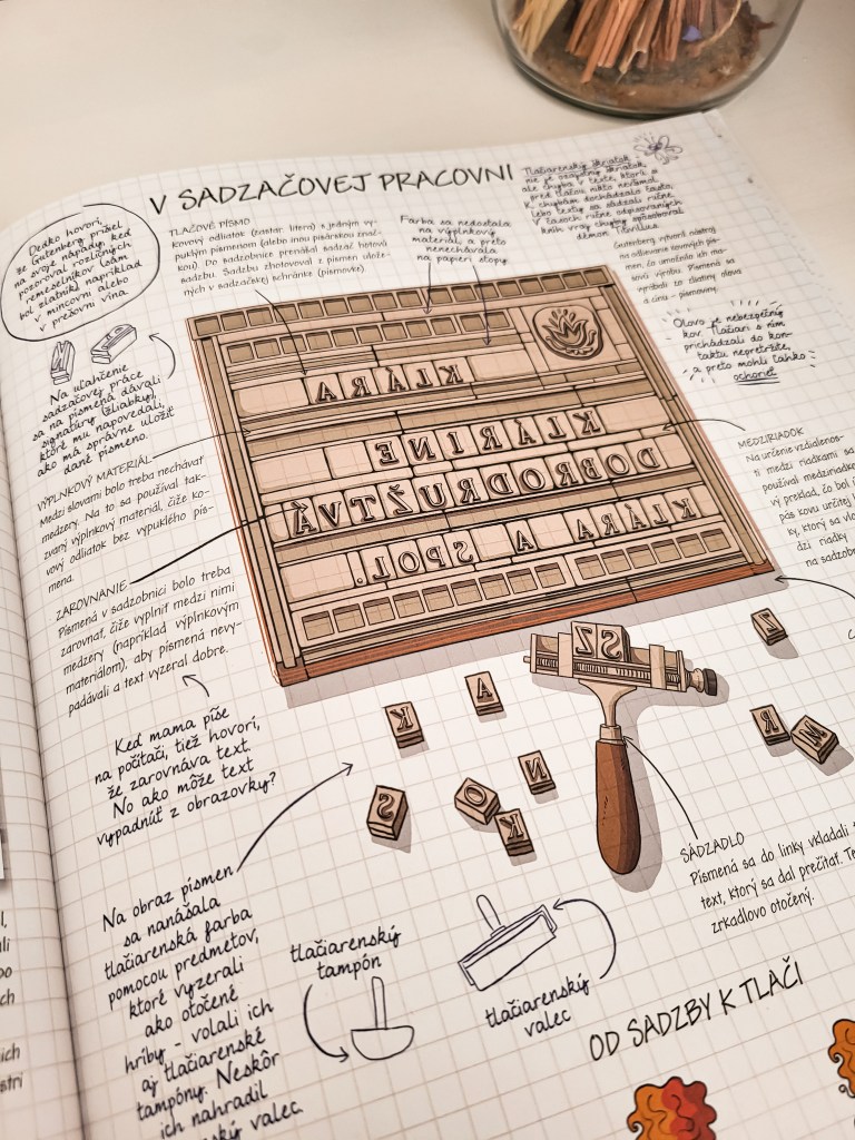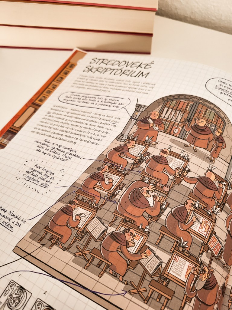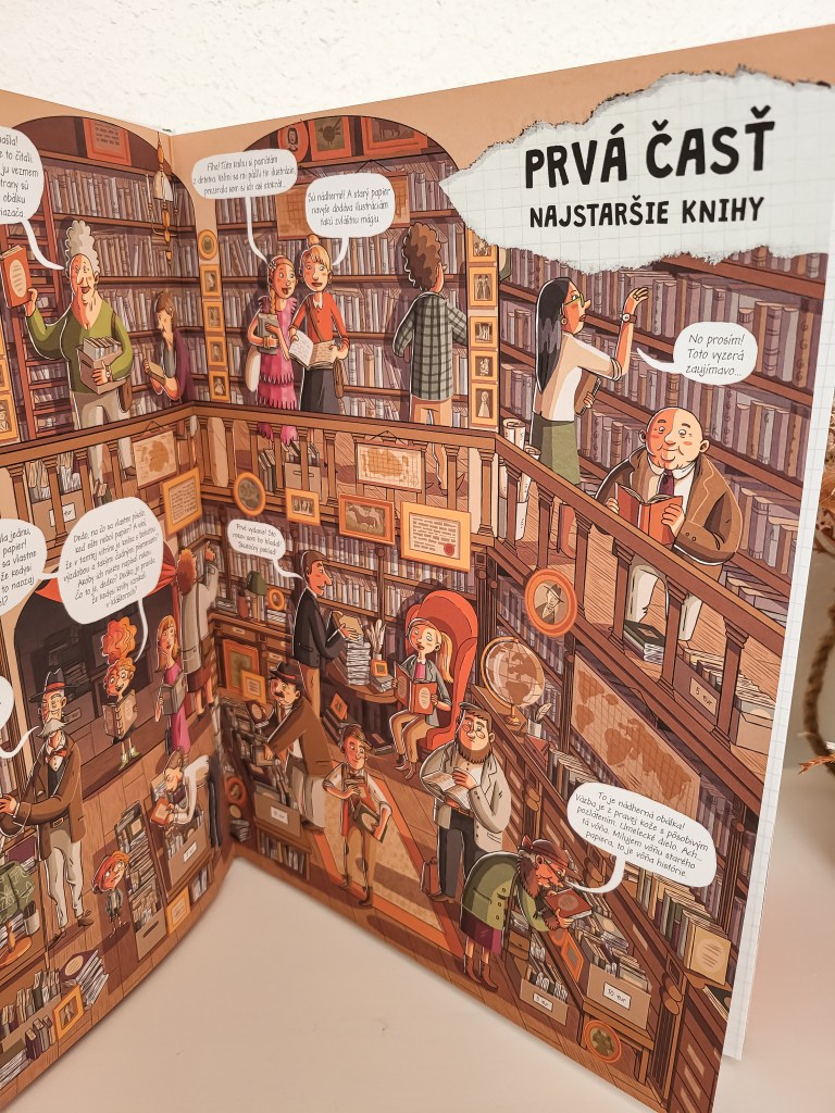 Tému najstarších kníh začína dedko s vnúčatami v antikvariáte. Miesto, kde ľudia nájdu vzácne poklady, knihy, ktoré mali radi v detstve alebo možno špeciálne vydania. V tejto časti sa okrem iného dozvieme, ako sa príbehy či informácie zaznamenávali predtým, ako vznikla kniha v podobe ako ju poznáme. Hlinené doštičky, papyrus či dokonca šnúrky s uzlíkmi vedeli zaznamenať dôležité informácie. Nás doma najviac prekvapil korytnačí pancier. Ďalej sa deti dozvedia, čo majú spoločné s knihami mnísi. Ako museli opraviť chybu, ktorá sa nedala len tak vygumovať? A ako sa kniha zošívala? Všetko je tu krásne vyobrazené. My so synom sme iba fascinovane skúmali obrázky. V kapitole o najstarších knihách sa deti dozvedia aj veľa zaujímavostí o papieri. Nielen to, kto bol za jeho vznikom, ale aj to, ako sa postupom času menil a zdokonaľoval.