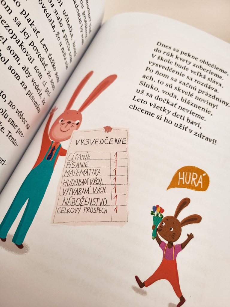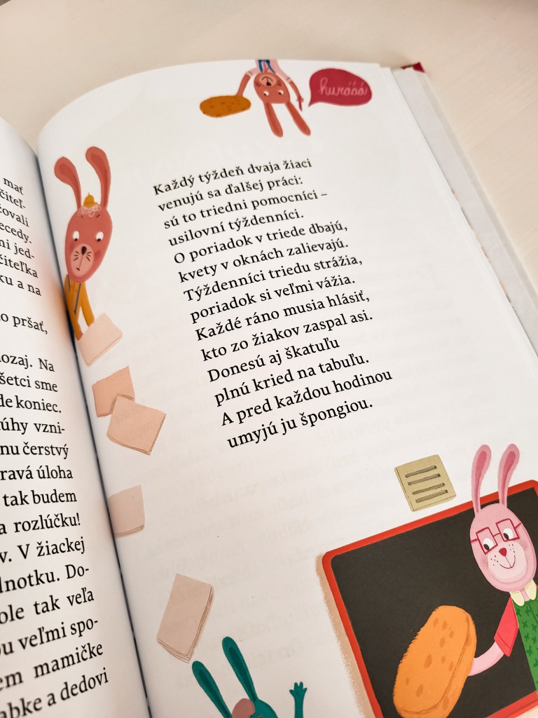 Ďalej už je v knihe rozobratý postupne školský rok. Prvý deň v škole, čo je to zvonenie, rozvrh hodín a kto sú to týždenníci. Deti sa dozvedia aj to, na čo slúži žiacka knižka a čo je to písomka. Musím oceniť, že autorka ukázala deťom nielen to, že môžu mať samé jednotky, ale aj to, že nie každý deň sa im bude dariť. Aj napriek tomu však treba prekonať lenivosť a pripraviť sa na písomku. Záver patrí samozrejme vysvedčeniu, ktoré si deti po celom školskom roku zaslúžia.