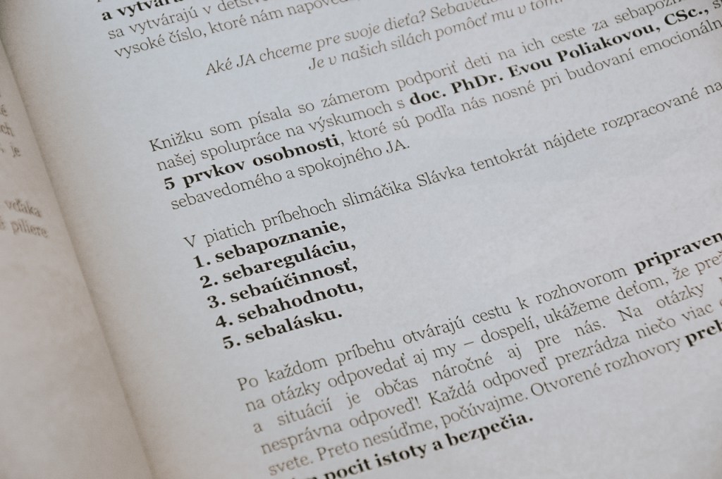 Kniha je rozdelená na 5 častí. Sebapoznanie, sebaregulácia, sebaúčinnosť, sebahodnota a sebaláska. Na prvý pohľad sa to môže zdať na detskú knihu komplikované. Autorka tieto prvky zakomponovala do príbehu a tak vďaka Slávkovi a inými zvieratkám deťom dokážeme tieto pojmy priblížiť a vysvetliť.