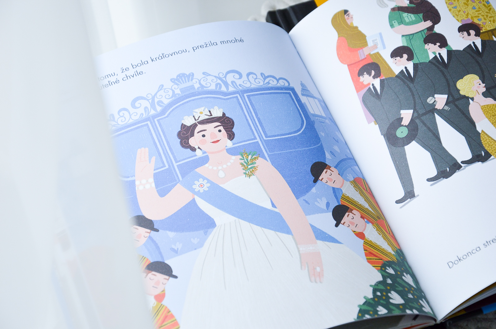 Na knihu Kráľovná Alžbeta II. som bola veľmi zvedavá. Keďže išlo o mimoriadne významnú panovníčku. Jej príbeh ukazuje, ako sa od mala pripravovala na pozíciu budúcej kráľovnej. Deti sa dozvedia, ako si šetrila kupóny na látku na svadobné šaty a aj ako sa stala kráľovnou. A to, že táto pozícia nie je žiadna zábava, sa deti v knihe dočítajú tiež. Stretnutia, ďaleké cesty, náročné rozhodnutia. Kniha spomína aj to, že práve Alžbeta podpísala zákon, ktorý dával dievčatám aj chlapcom rovnaké práva na následníctvo trónu.